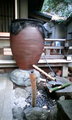 この水の壺(?)。 手前の竹筒に耳を当てると雫の音が反響した金属的な綺麗な音が聞こえます。 同じ仕組みの物が境内にもうひとつありまして、そっちは自分で水をじゃばじゃばするシステムなので、こっちより派手に聞えます。 聞いた感じがちょっと神秘的でありました。 |