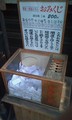 ![]() 何はともあれおみくじ。 こちら、お店仕舞いが早くて、何時もは夕方位で全部仕舞っちゃうからおみくじ引けた例がないです。 おみくじは二種類ありまして、一個は百円の普通のおみくじ。 |
