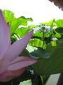 | 浮き葉は春先一番最初に出る葉で、文字通り水面に浮き、立ち葉より少し小振りです。 巻き葉は開く前の巻き貝みたいに巻いた状態の葉です。 ただ、どの状態であっても葉の基本的な形状と水の弾き方は同じですので、トップのは浮いているのも蓮の葉です。 (睡蓮は葉の切り込み具合が違う) 夏場、蓮の花が普通の花屋さんに並ぶ事があるのですが、正直素人さんには難しいだろうと思います。 蓮は水が揚がらないので、専用のポンプで無理矢理水を押し込んで揚げてあげるのです。 私が凄いのではなく、道具が凄いのです。 |